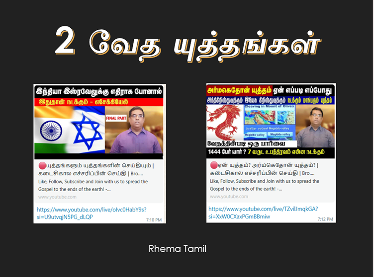 இஸ்ரவேல் போர் குறித்து ஒரு சகோதரர் என்னிடம் முக நூலில் குறுஞ்செய்தி அனுப்பினார். ஒரேஒரு காரியத்தை நான் பகிர நினைக்கிறேன். உக்ரைன் – ரஷ்யா போர் ஆரம்பித்த புதிதில், ஒரு youtube channelல் தினமும் செய்தி (NEWS) கேட்பேன். Tamil Pokkisham என்கிற அந்த channelல் தினமும் கேட்கும்போது, ஒருமுறை விக்கி என்கிற அந்த சகோதரர் கூறினார், ரஷ்ய அதிபர் புதின், இஸ்ரவேலரை தாக்கி பேசியுள்ளார். ‘ஹிட்லர் ஒரு யூதன் என்று அவர் பேசியதற்கு, ரஷ்யா மன்னிப்பு கேட்க வேண்டும்’ என்று இஸ்ரேல் அதிபர் கூறி இருக்கிறார். ஒரு வேளை இந்த சண்டை, பெரிதாகுமானால், கிறிஸ்தவர்கள் பல வருடங்களாக எதிர்பார்த்துக் கொண்டிருக்கிற, இஸ்ரேல்- ரஷ்யா யுத்தம் வரும் என்று கூறினார். எனக்கு ஒரே ஆச்சரியம். “ஒரு கிறிஸ்தவரல்லாதவர், நமது வேதத்தில் போட்டிருப்பதாக ஒரு யுத்தத்தைப் பற்றி பேசுகிறார். ஆனால் எனக்கு அதைப் பற்றி எதுவும் தெரியவில்லையே” என்று உண்மையாக மனம் வருந்தினேன். அப்பொழுது Youtube மூலமாக எசேக்கியேல் 36,37 அதிகாரங்களில், இஸ்ரேல் – ரஷ்யா யுத்தம் இருக்கிறது என்பதையும், அதேபோல கடைசி யுத்தமாகிய அர்மெகதோன் யுத்தத்திற்கு பூமி தயாராகி வருகிறது என்பதையும் அறிந்து கொண்டேன். இரண்டு யுத்தம் பற்றியும் எனக்கு இரண்டு வருடங்களுக்கு முன்பு தான் தெரியும். நீங்கள் ஏற்கனவே அறிந்திருப்பீர்கள் என்று நம்புகிறேன். ஒருவேளை நீங்கள் இன்னும் அதைப் பற்றி அறியாமலிருந்தால், நிச்சயமாக அறிந்து கொள்ளுங்கள், தேவனை அறியாத ஒருவருக்கு நம் வேதம் தெரிகிறது, இத்தனை வருடங்கள் கிறிஸ்தவர்களாக இருக்கும் நமக்கு, அதைப்பற்றி தெரியவில்லை என்றால், நாம் தான் பரிதாபத்துக்கு உள்ளானவர்கள். நேரமிருந்தால் கேட்டுப் பாருங்கள். நன்றி