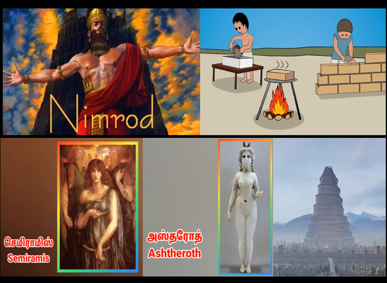 நிம்ரோத்தின் கனவு பாபேல் கோபுரம் ziggurat. Pyramidal stepped temple tower. தங்களுக்கு பெயர் உண்டாக நிம்ரோத்தும் அவன் மனைவி சிம்ராஸ்ம் இணைந்து கட்டிய கோபுரம் தான் பாபேல் கோபுரம். தண்ணீரால் தங்கள் முன்னோரை தேவன் அழித்து போட்டதை அறிந்திருந்த நிம்ரோத், இனி தண்ணீர் மூலமாக அழிவு வராதபடி, வானை எட்டுமளவு கோபுரம் கட்ட நினைத்தான். ஆனால், மண்ணினால் கட்டினால், கோபுரம் இடிந்து விடும், எனவே மண்ணை சுட்டு செங்கல் கண்டுபிடித்தான். கோபுரம் கட்ட ஆரம்பித்தான்.  அந்தக் கோபுரத்தில் உள்ளே 12 zodiac sign இருந்ததாக தொல்பொருள் ஆராய்ச்சியாளர்கள் கண்டுபிடித்துள்ளார்கள். அங்கே இருந்து உலகுக்கு பரவியது தான், மந்திர வித்தைகளும், விக்கிரகங்களும்.
