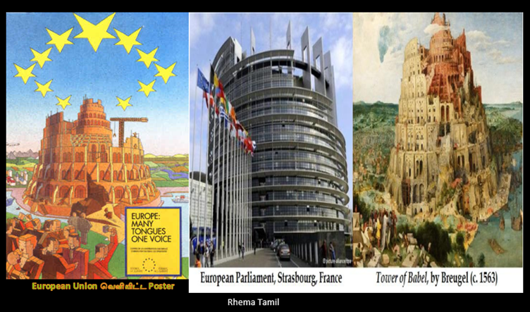 இந்த நிம்ரோத் ஆரம்பித்த ஒரே ராஜ்யம், ஒரே மொழி, ஒரே கடவுள் என்பது அன்றோடு அழியவில்லை. இன்றும் இருக்கிறது. நிம்ரோத் விட்டுச் சென்ற அதே கோபுர வடிவில் தான், European Union HQ உள்ளது. அவர்கள் வெளியிட்ட ஒரு போஸ்டரில், பாபேல் கோபுர படமும், ஒரு கிரேன் அதற்கு பின்னாக இருப்பதை போலவும் வெளியிட்டார்கள். அதற்கு அர்த்தம் கோபுரம் இன்றும் கட்டப்பட்டுக் கொண்டிருக்கிறது. இந்த பாபேல் கோபுரத்தைக் கட்டியதால் பாஷைகள் பிரிந்தது. இந்த போஸ்டரில், Many tongues, One Voice என்று எழுதப்பட்டிருக்கும். உலக நாடுகளின் சமாதானத்துக்காக இந்த யூனியன் இருக்கிறது என்று சொல்லி, இதன் கீழ் உலக நாடுகள் இணைந்து கொண்டிருக்கிறது, நாமும் கூட சம்பந்தமே இல்லாமல் Union of India என்று தான் Driving Licence கூட பெறுகிறோம். நிம்ரோத் ஆரம்பித்தது இன்றும் உள்ளது. கர்த்தரின் வருகை வரை இருக்கும்.