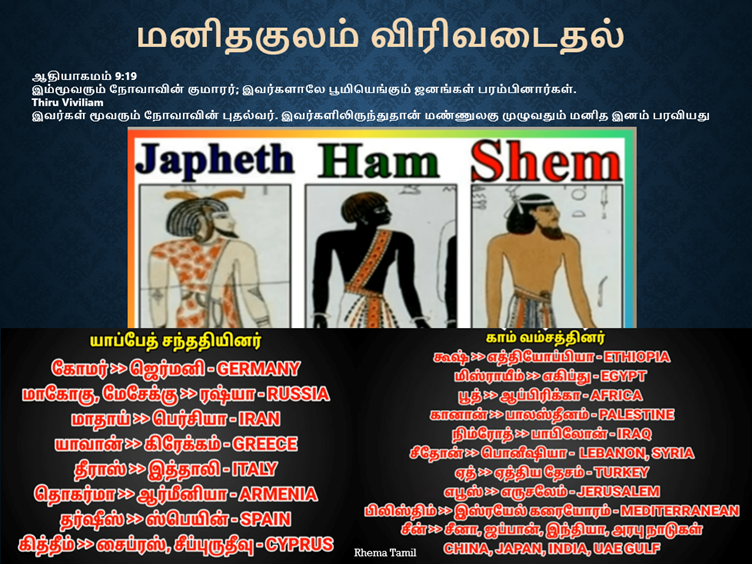 பூமியை நிரப்புங்கள் என்பது தேவ திட்டம், பூமியில் சிதறிப் போய்விடக் கூடாது என்பது சாத்தானுடைய திட்டம். அவர்கள் கட்டிய நகரம்தான் பாபிலோன். கட்டிய கோபுரம் பாபேல் கோபுரம். எல்லா இராட்சதரும் அழிந்து போய் விட்டார்கள், பரிசுத்த வித்தாகிய நோவா குடும்பம் மட்டும் தான் பூமியில் இருந்தது. பின்னர் எப்படி மீண்டும் பாவம் வந்தது? நோவா காமின் குமாரனாகிய கானானை சபித்தார் அல்லவா, அதன் மூலமாக பாவம் வந்து விட்டது. கானானுக்கு எப்படி தெரிந்தது பழைய பாவங்கள்? தூதர்கள் உலக அழிவுக்கு முன் ஜனங்களிடம் வந்து, நிறைய காரியங்கள் கற்றுக் கொடுத்தாக பார்த்தோம் அல்லவா? அவை எல்லாம் அங்கிருந்த குகையில் எழுதப்பட்டிருந்ததை கானான் வாசித்து, அதன் மூலமாக மீண்டும் பூமியில் பாவத்தை பரப்ப ஆரம்பித்தான். பெற்றோரின் வார்த்தைகள் பிள்ளைகள் வாழ்வில் நிச்சயமாக நடக்கும் என்பதன் ஆதாரம் கானான்.
