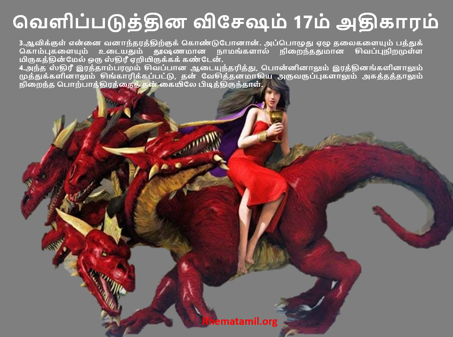 3 ஆவிக்குள் என்னை வனாந்தரத்திற்குக் கொண்டுபோனான். அப்பொழுது ஏழு தலைகளையும் பத்துக் கொம்புகளையும் உடையதும் தூஷணமான நாமங்களால் நிறைந்ததுமான சிவப்புநிறமுள்ள மிருகத்தின்மேல் ஒரு ஸ்திரீ ஏறியிருக்கக் கண்டேன்.