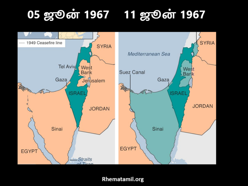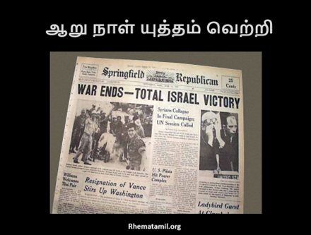 இப்பதிவை வாசிப்பதை விட, இந்த காணொலியில் இஸ்ரேல் ஜெயித்த வரலாறை கேட்பது மிகவும் நன்றாக இருக்கும். நேரம் இருந்தால் இஸ்ரேலின் இந்த வெற்றியை தமிழில் கேட்டு இரசிக்கலாமே!