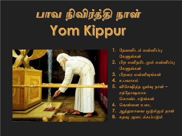September 24,2023 Evening 6லிருந்து, September 25 Evening வரை பாவ நிவிர்த்தி நாள் என்கிற  ஆறாம் பண்டிகை கொண்டாடப்படுகிறது. ஆம், இன்று எபிரேய காலண்டரில் ஏழாவது மாதம் 10ம் தேதி. கர்த்தர் கொண்டாடச் சொல்லிய ஏழு பண்டிகைகளில், ஆறாவது பண்டிகை இன்று. எபிரேய ஏழாம் மாதத்தில் முதல் நாள் Rosh Hashannah என்று, முதல் பதிவாகப் படித்தோம். ஒரு சுவாரஸ்யமான விஷயம் என்னவென்றால், எபிரேய ஏழாம் மாதம் முதல் தேதியிலிருந்து, எபிரேய ஏழாம் மாதம் பத்தாம் தேதி வரை, இந்த 10 நாட்களை பரவசத்தின் நாட்கள் (Days of Awe) என்று கூறுகிறார்கள். 10 days of Fasting என்று இந்த நாட்களை நியமித்து,  பத்தாவது நாளுக்காக காத்திருப்பார்கள். இந்த நாளானது இஸ்ரேலருக்கு அவ்வளவு முக்கியமான நாள். இந்த 10 நாட்களும் பரலோகத்தின் தேவனிடம் மன்றாடி, தங்கள் பெயரை ஜீவபுஸ்தகத்தில் எழுத வைக்கும் நாட்களாக கருதுகின்றனர். கடந்த ஒரு வருடம் செய்த பாவங்களுக்கு மன்னிப்பு பெறும் நாட்களாக கருதுகின்றனர். இன்றைய நாளின் முடிவில் ஒரு எக்காளம் ஊதுவார்கள். அதோடு பரலோகத்தின் கதவுகள் மூடப்படுவதாக கருதுகின்றனர் இஸ்ரவேலர்கள்.